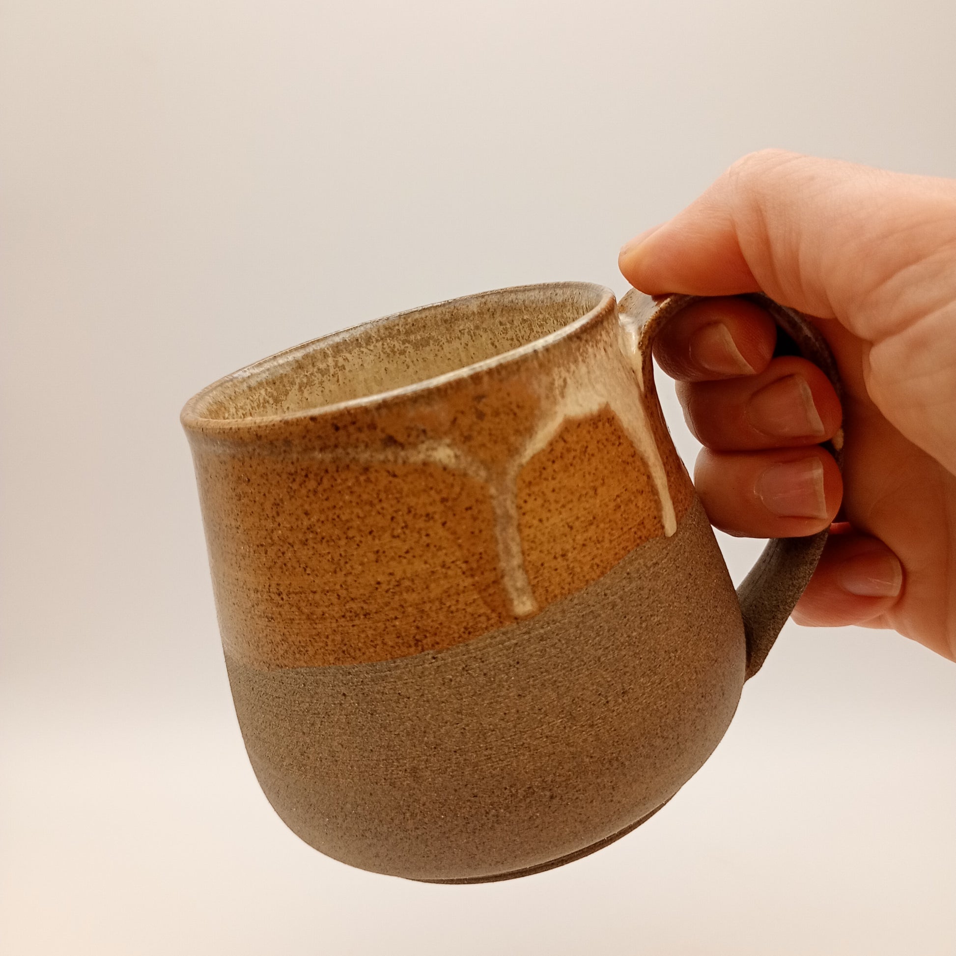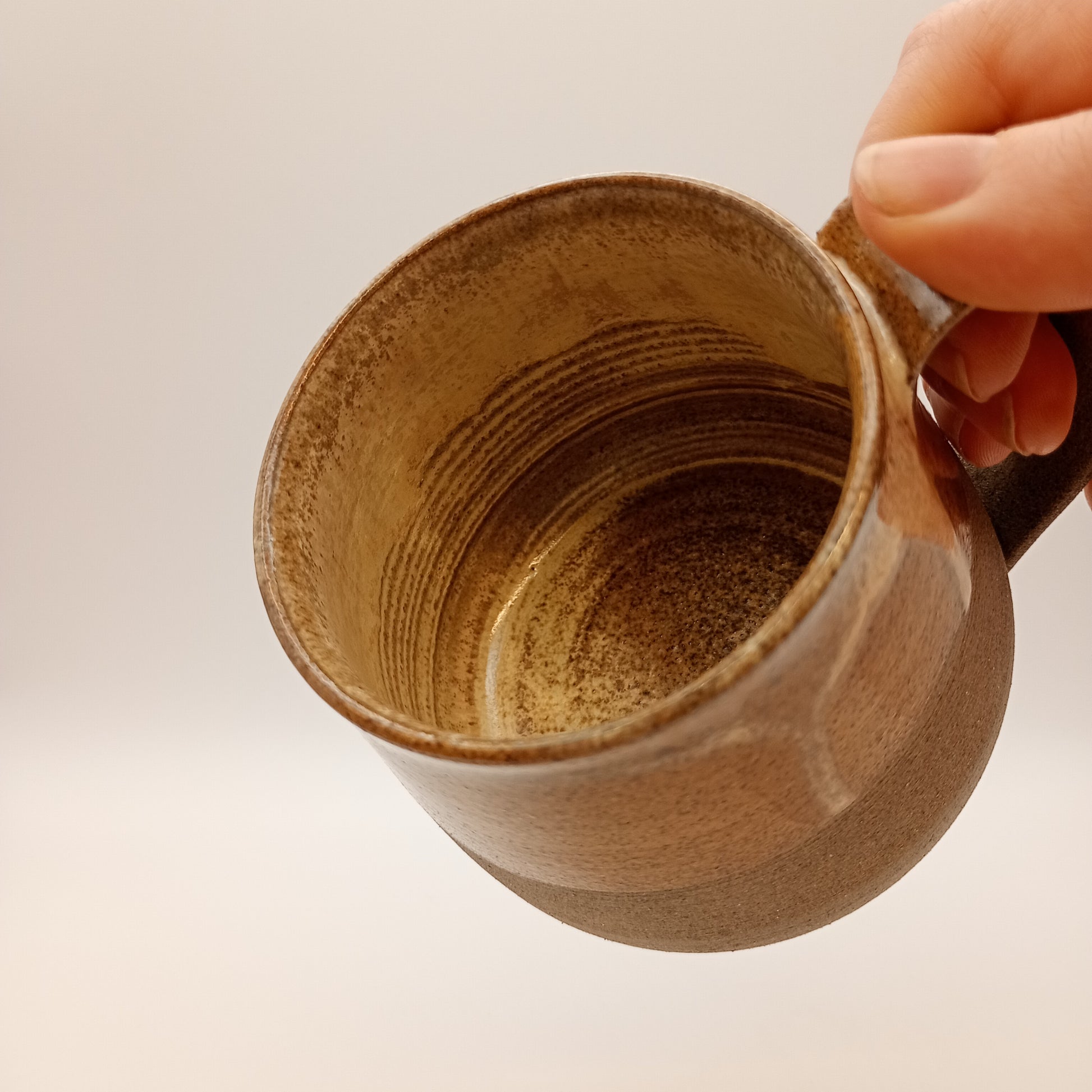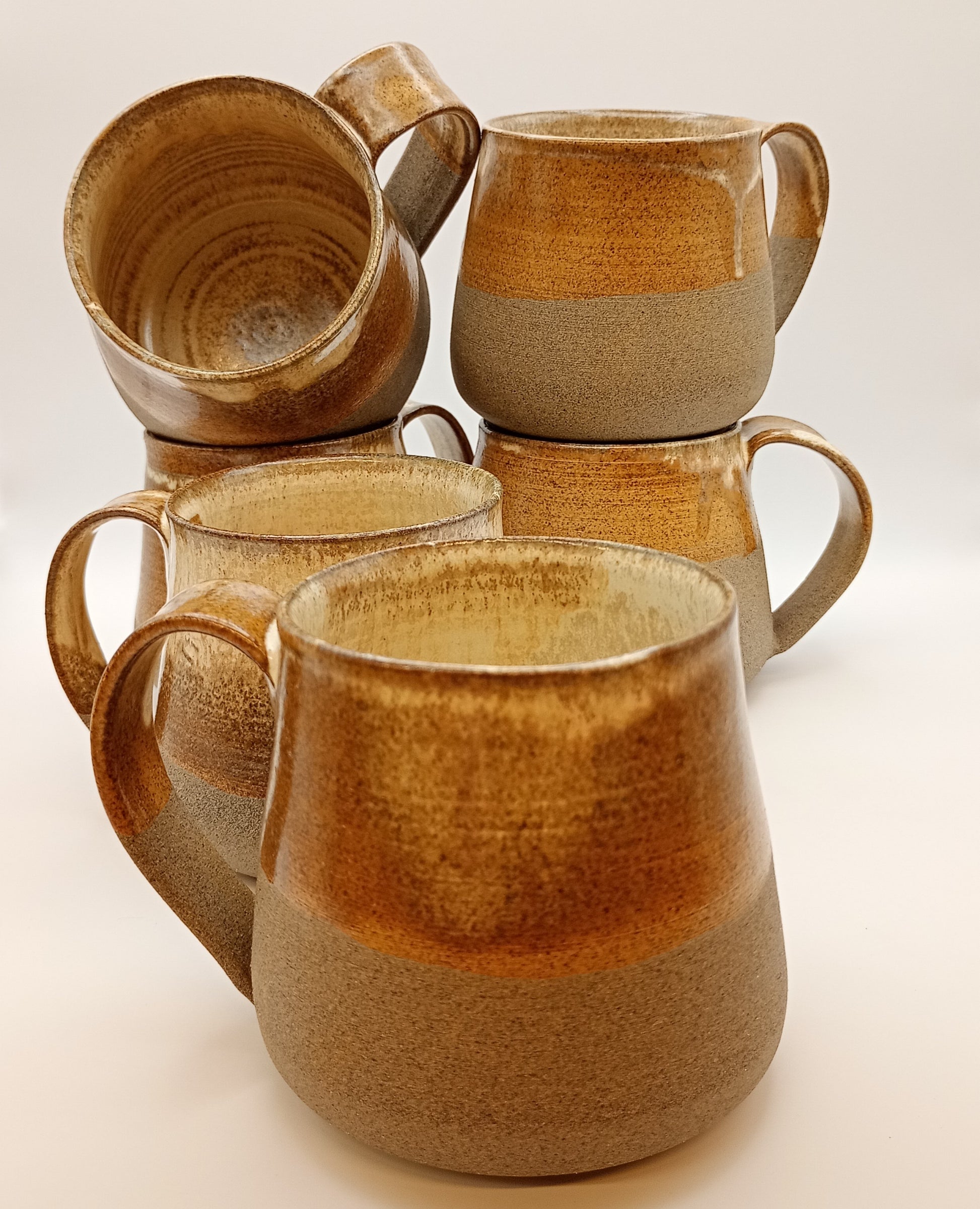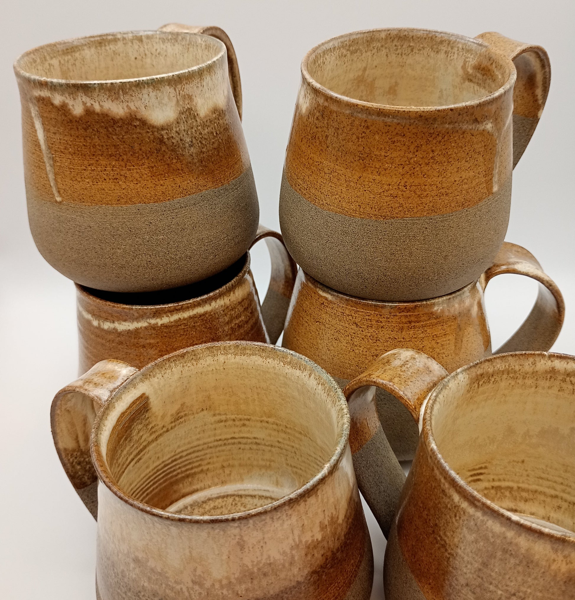 Kopperne med det rustikke udtryk er kun halvt glaseret på ydersiden, så man kan se det rå grå stentøjsler, som kopperne er drejet i. De er glaseret indvendigt og på hanken, så de er behagelige at holde og drikke af. Glasuren changerer mellem en cremet hvid og en karamelfarve og fremhæver drejerillerne i kopperne.