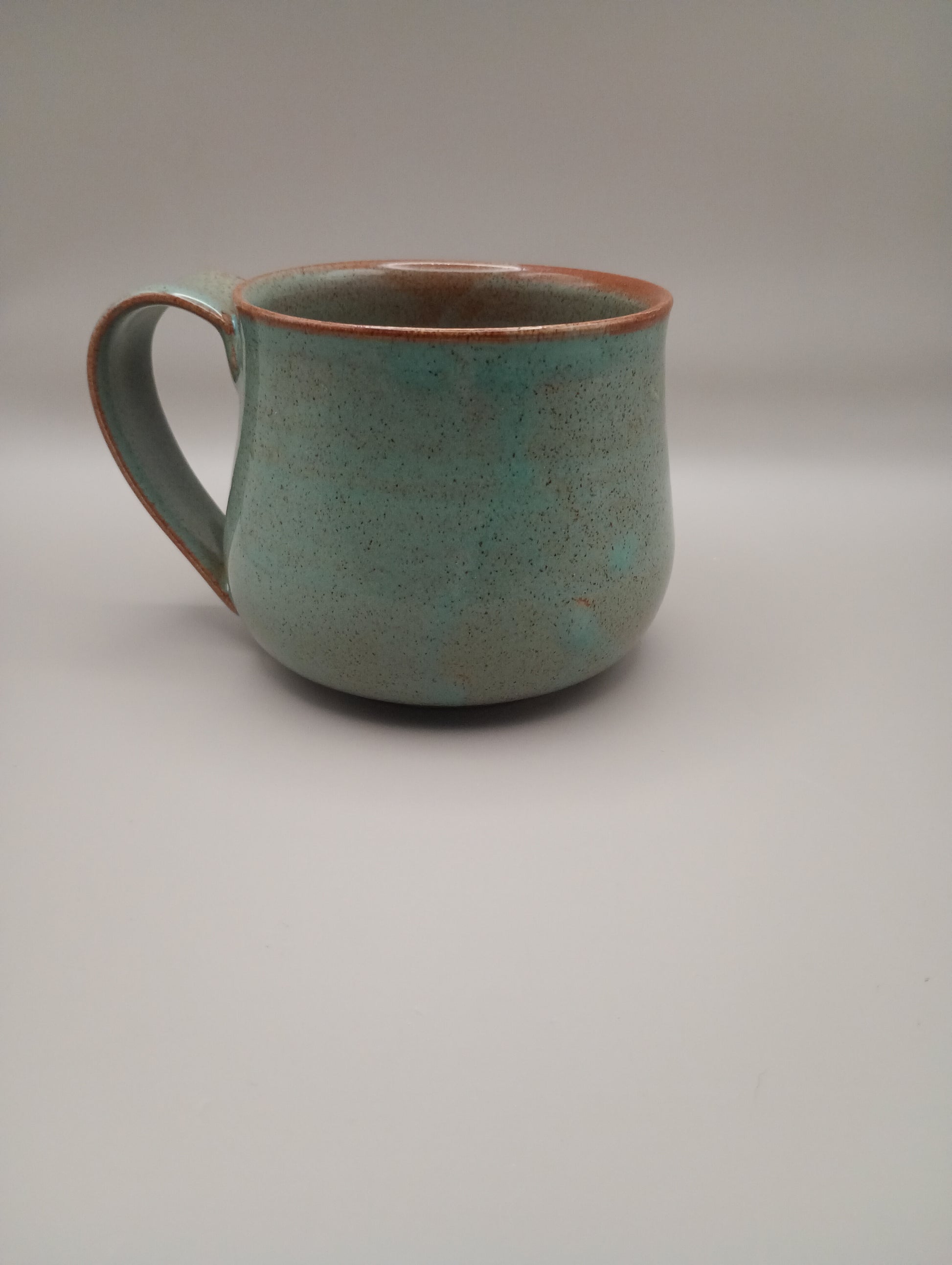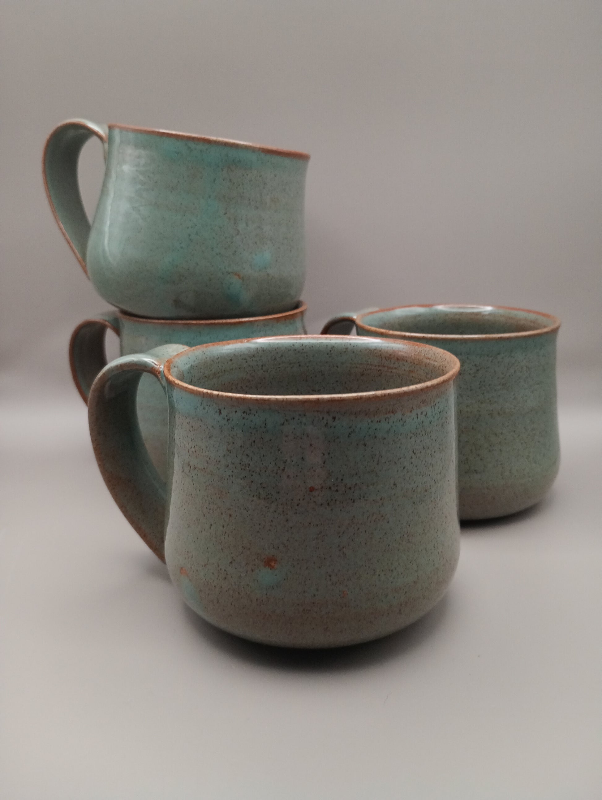 Kopperne er glaseret i en grønlige og brunlige nuance som koppe der rirrer. De kan indeholde Ca. 400 milliliter. De er drejet i hvidstentøjsler.