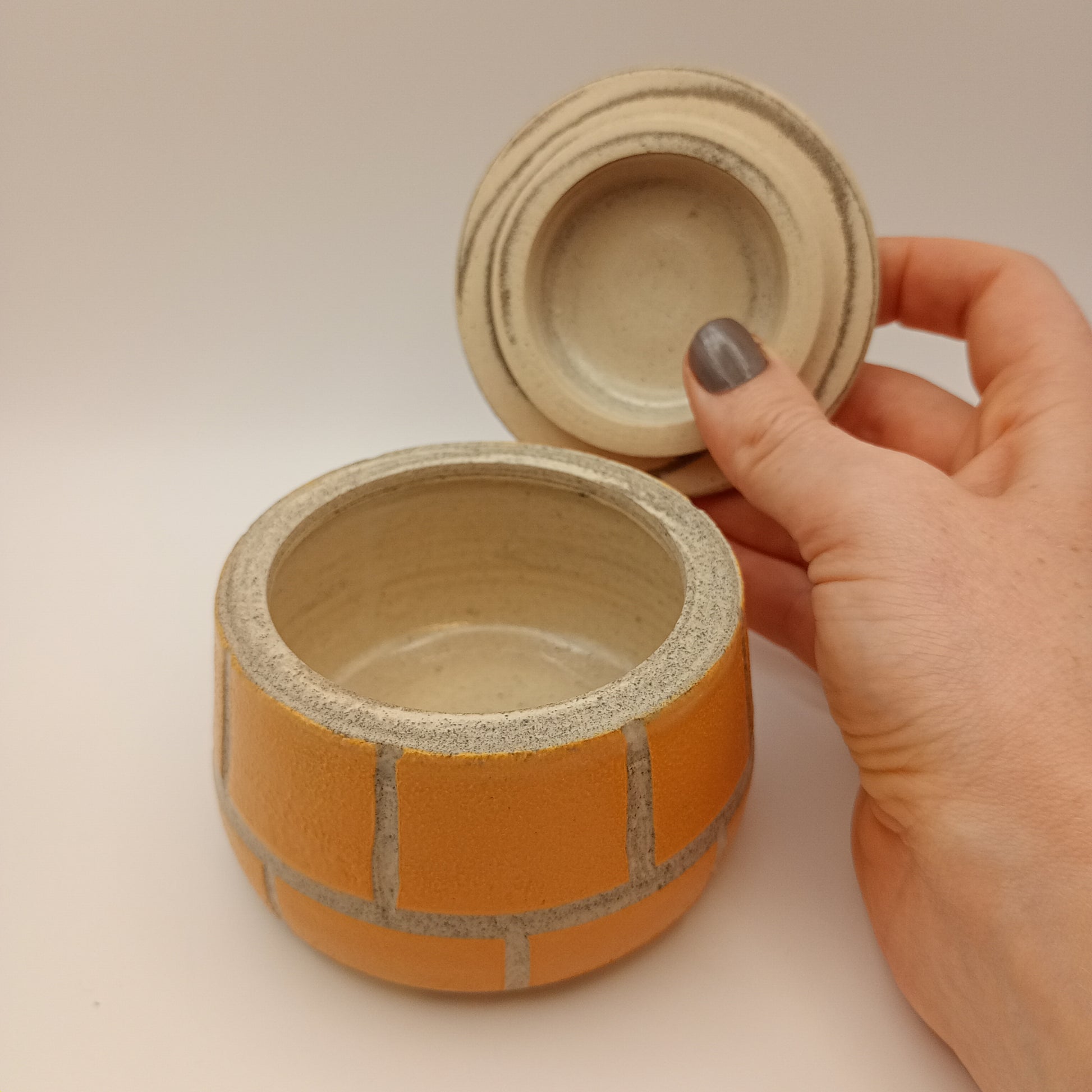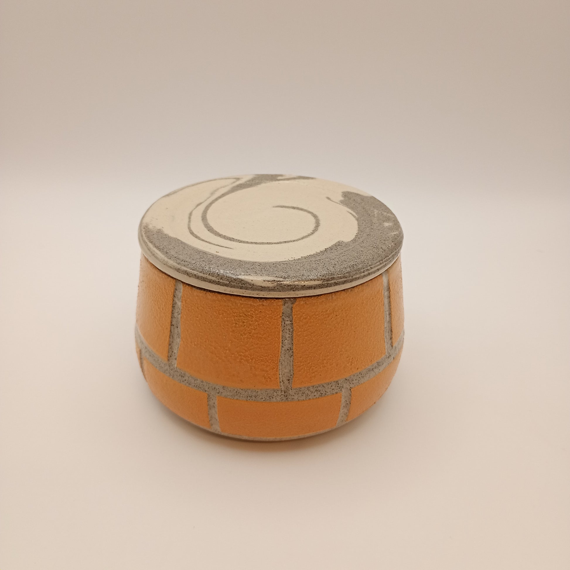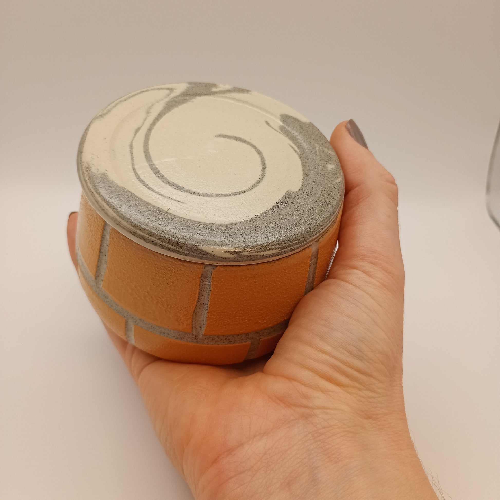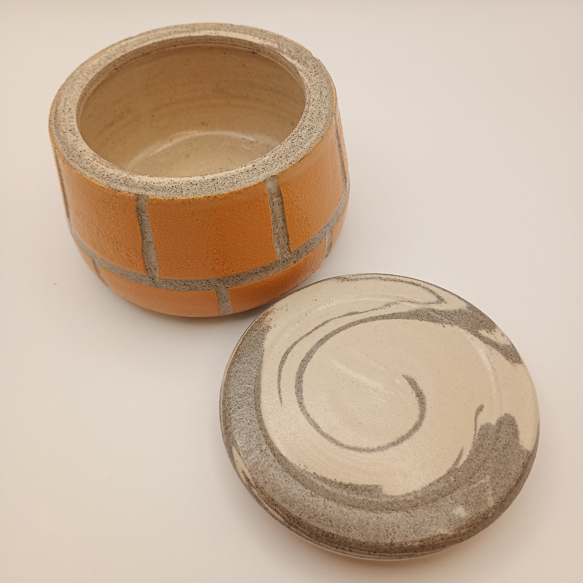 Den er drejet i en blanding af hvid og grå stentøjsler. Den er dekoreret med begitninger og glaseret i transparent glasur