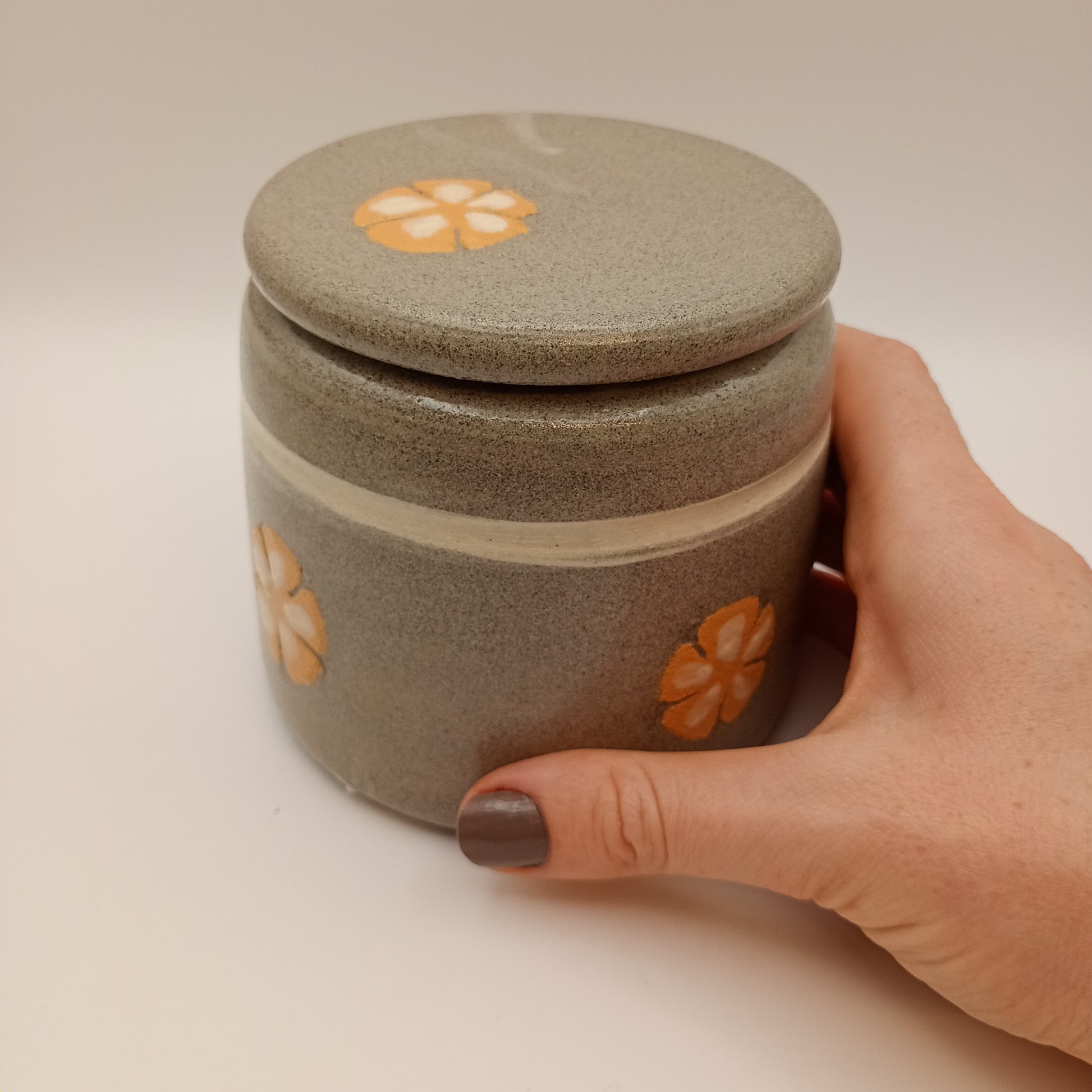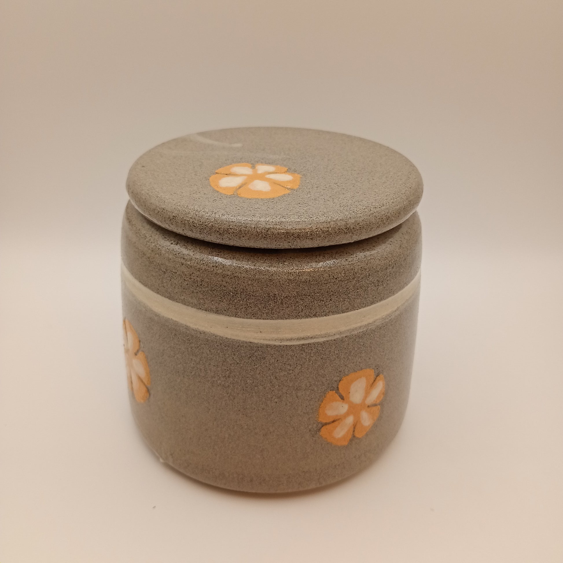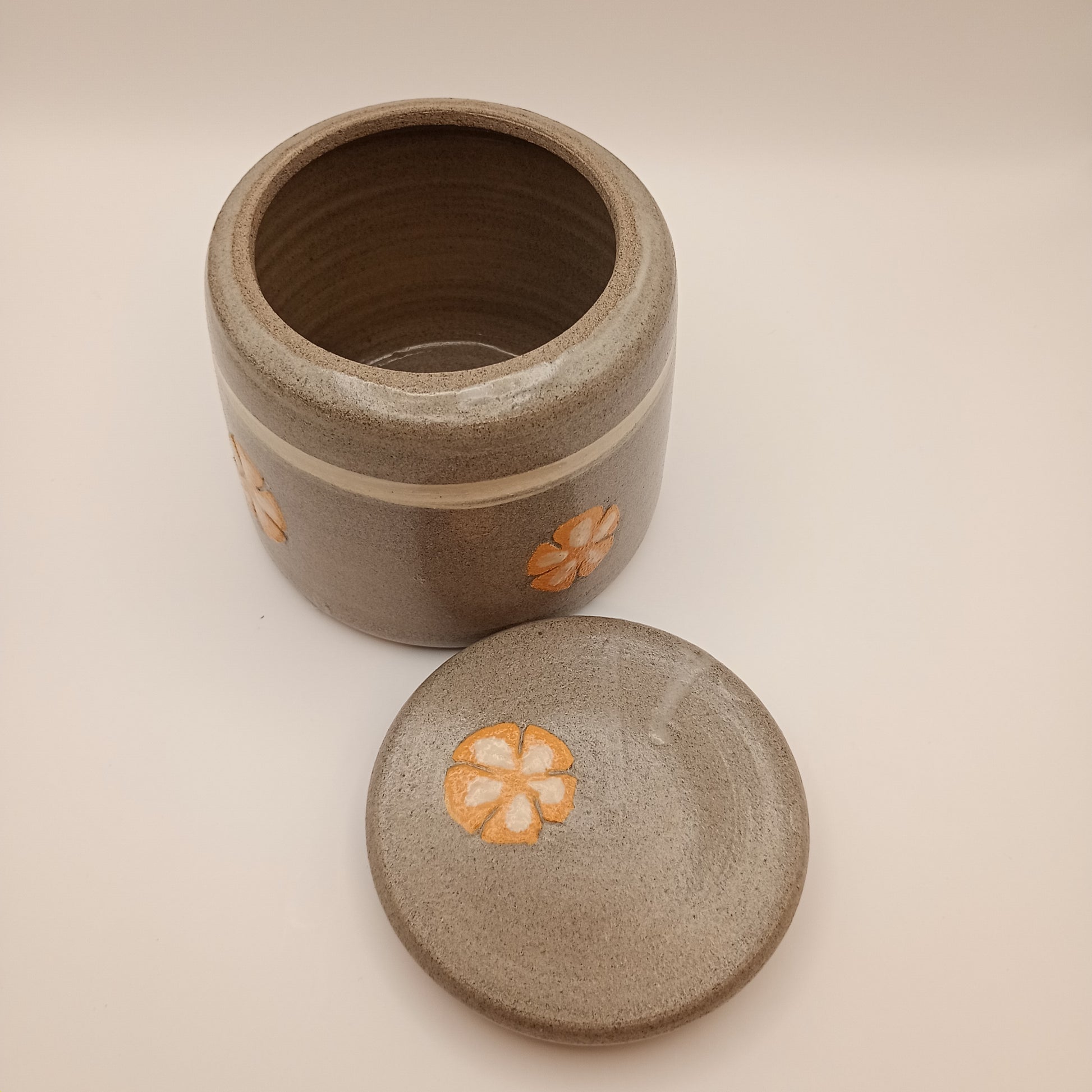 Den er drejet i gråstentøjsler. Den er dekoreret med begitninger og glaseret i transparent glasur